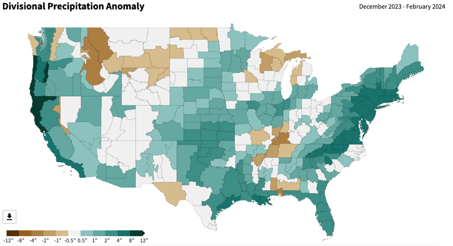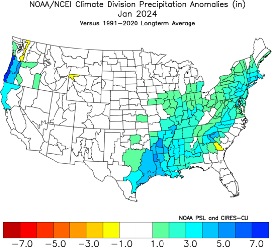 - Figure 6. United States climate division precipitation anomalies (inches) for January 2025 (NOAA, NCEI, Climate at a Glance: Divisional Mapping).