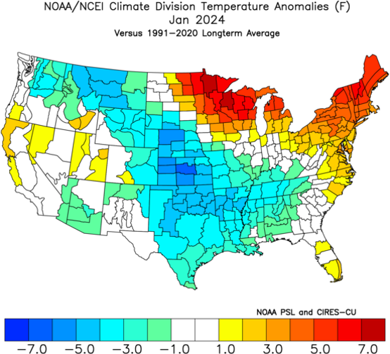 - Figure 5. United States climate division temperature anomalies (oF) for January 2025 (NOAA, NCEI, Climate at a Glance: Divisional Mapping).