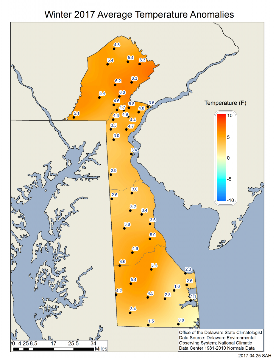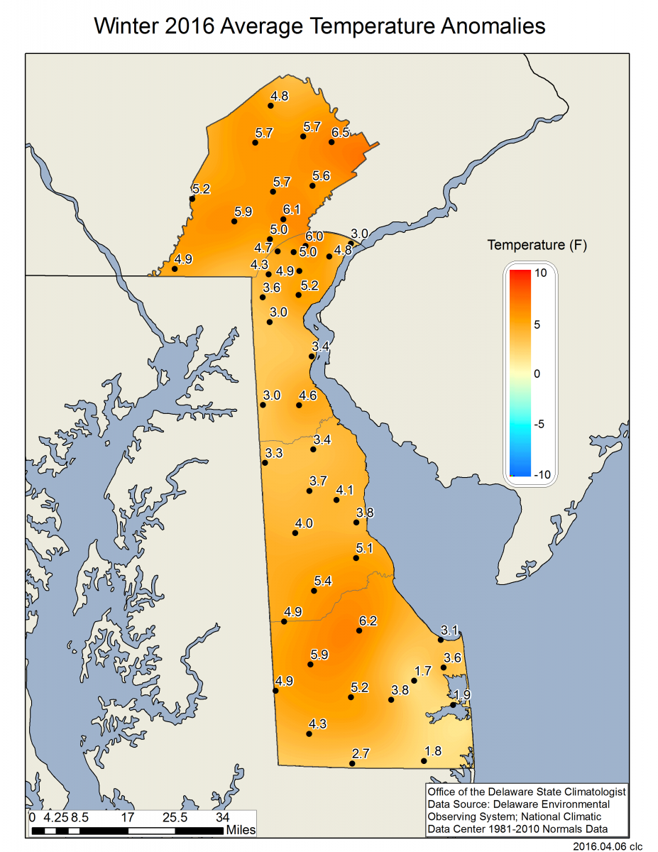 Data from the Delaware Environmental Observing System (DEOS) show that temperature departures were uniformly below normal across the entire State (Figure 4). Precipitation departures were