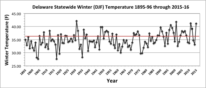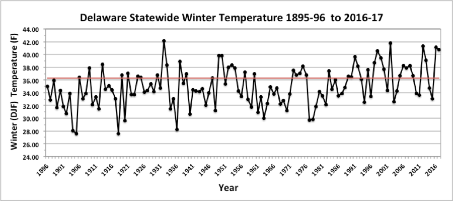 - Figure 1. Delaware statewide mean January temperature (°F) 1895-2018. Light gray line indicates 1981-2010 normal.