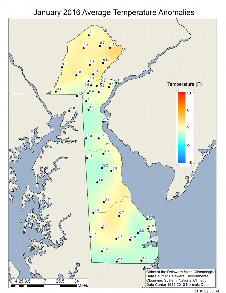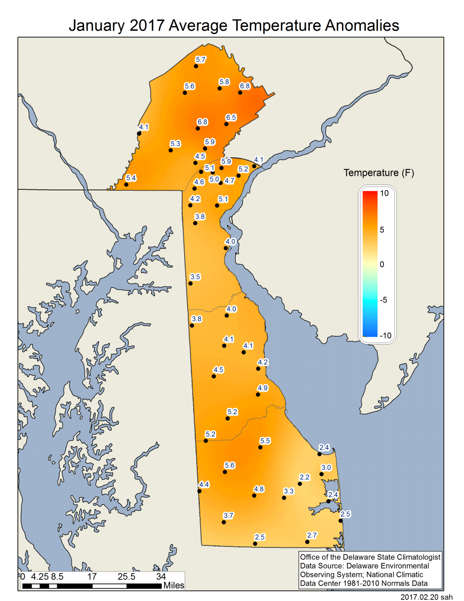 Data from the Delaware Environmental Observing System (DEOS) show that winter temperatures across the entire State were above normal, with the largest anomalies found in northern Sussex and northern New Castle counties in Delaware and in Chester County, PA (Figure 3).