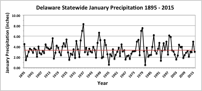- Figure 2. Delaware statewide winter precipitation (inches) 1895-2017. Red line indicates 1981-2010 normal.