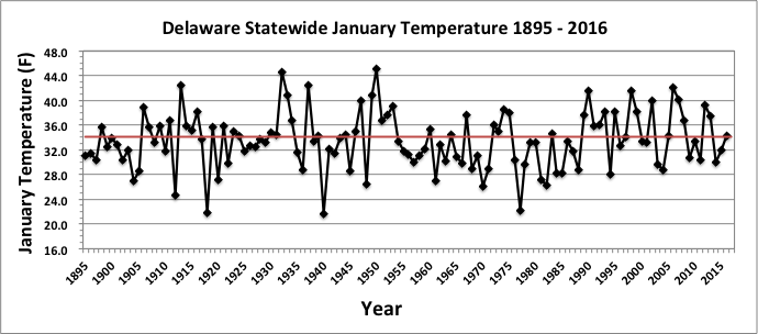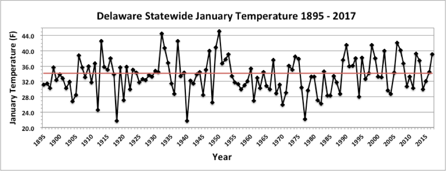 - Figure 1. Delaware statewide mean winter temperature (°F) 1895-2017. Red line indicates 1981-2010 normal.