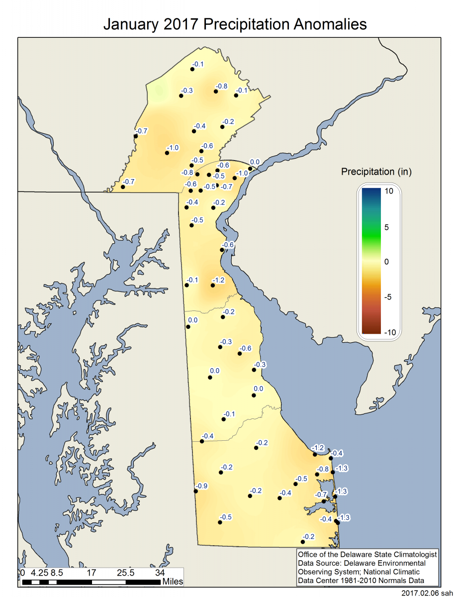 Delaware’s statewide precipitation for January 2018 averaged 2.97 inches, 0.35 inches below the 1981-2010 mean (Figure 3). Snowfall was also below normal during the month in northern Delaware with
