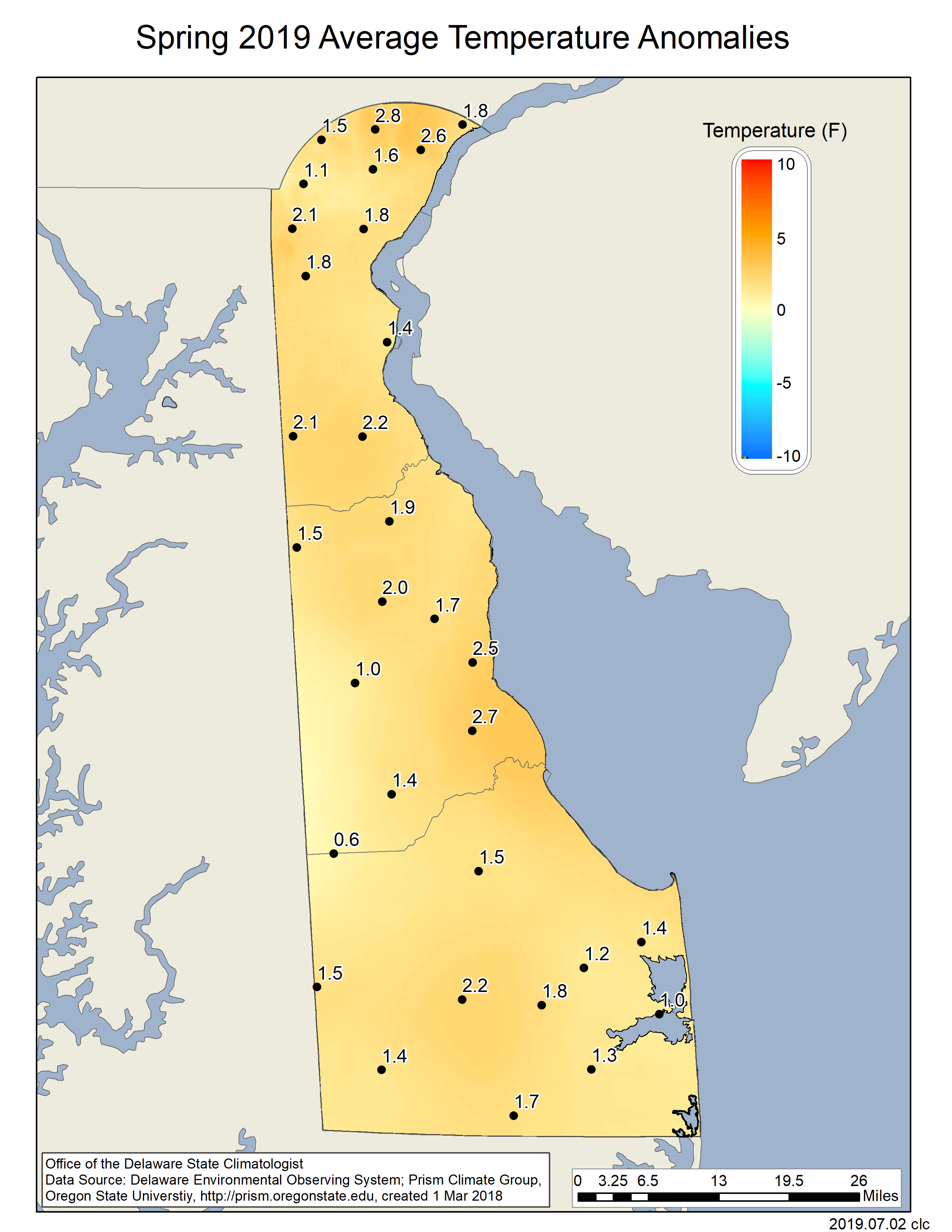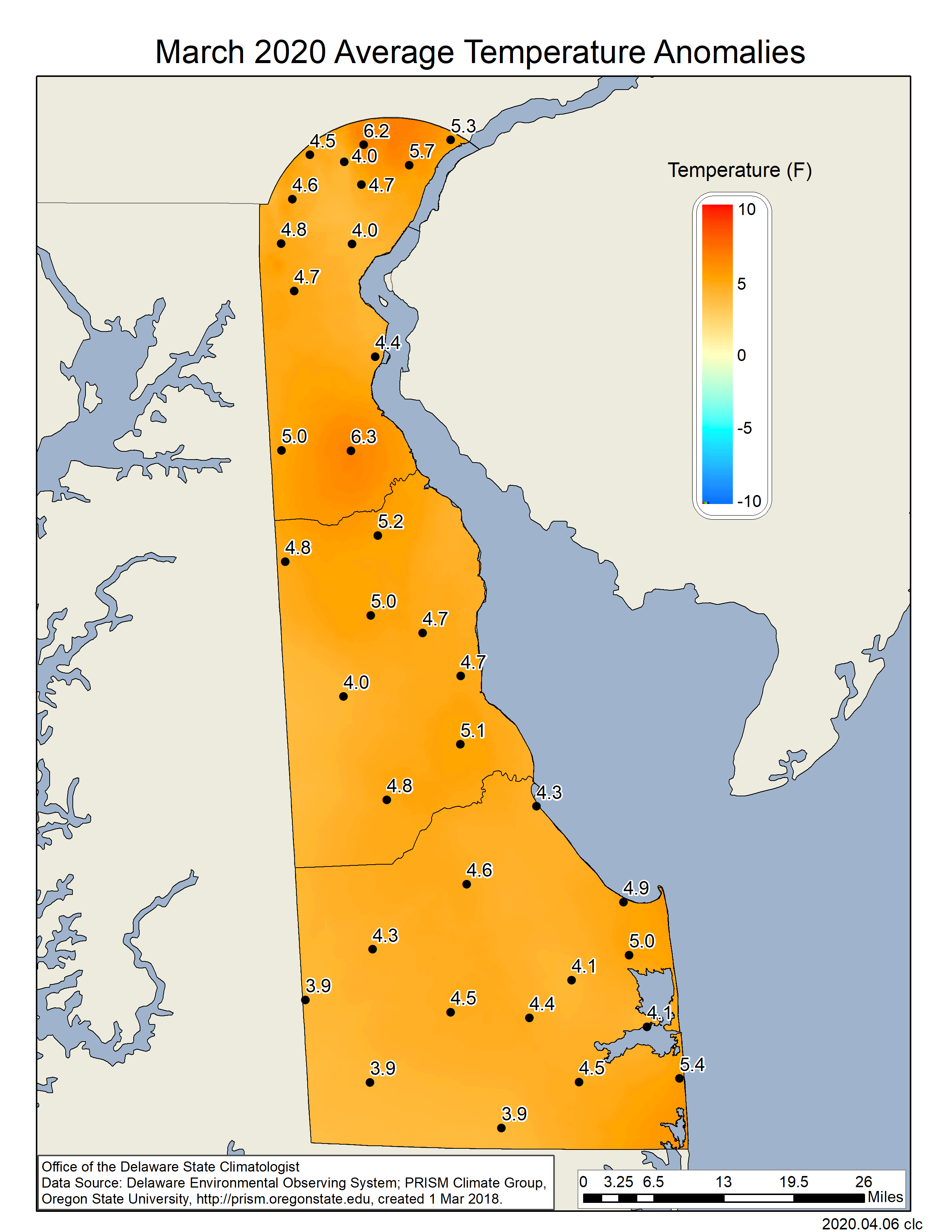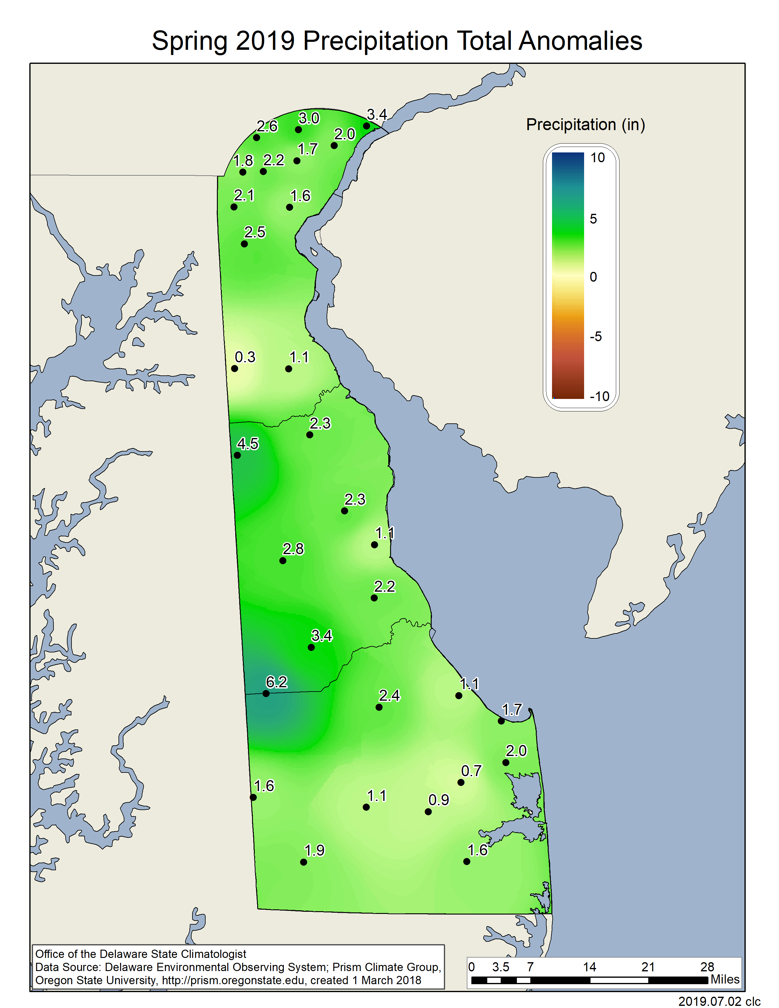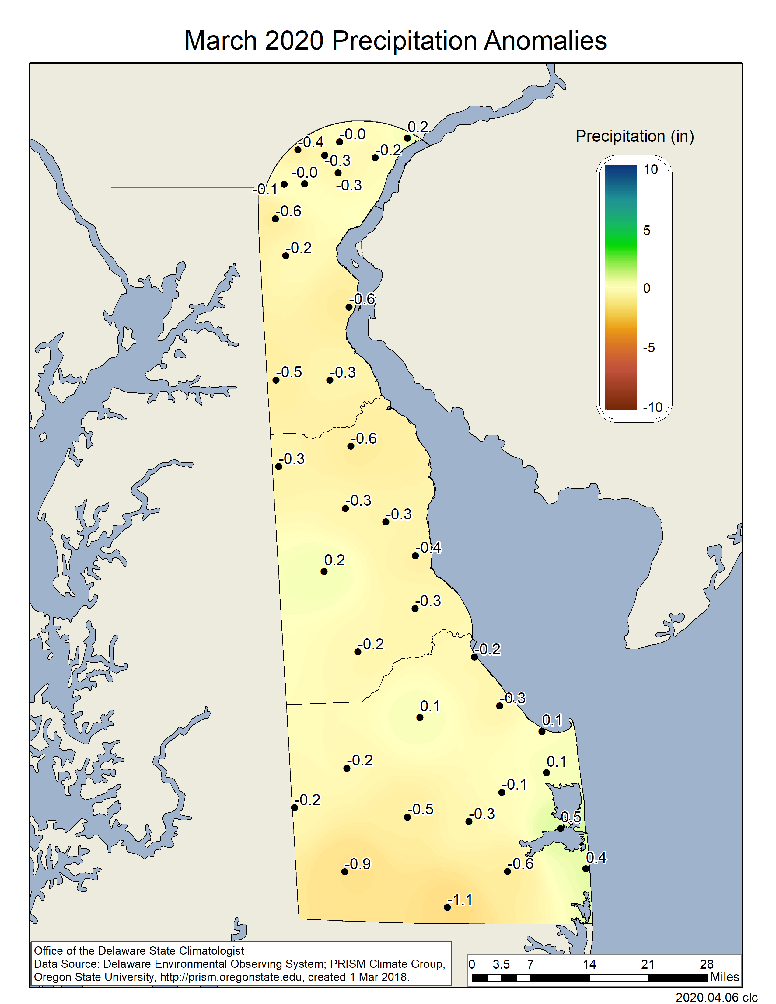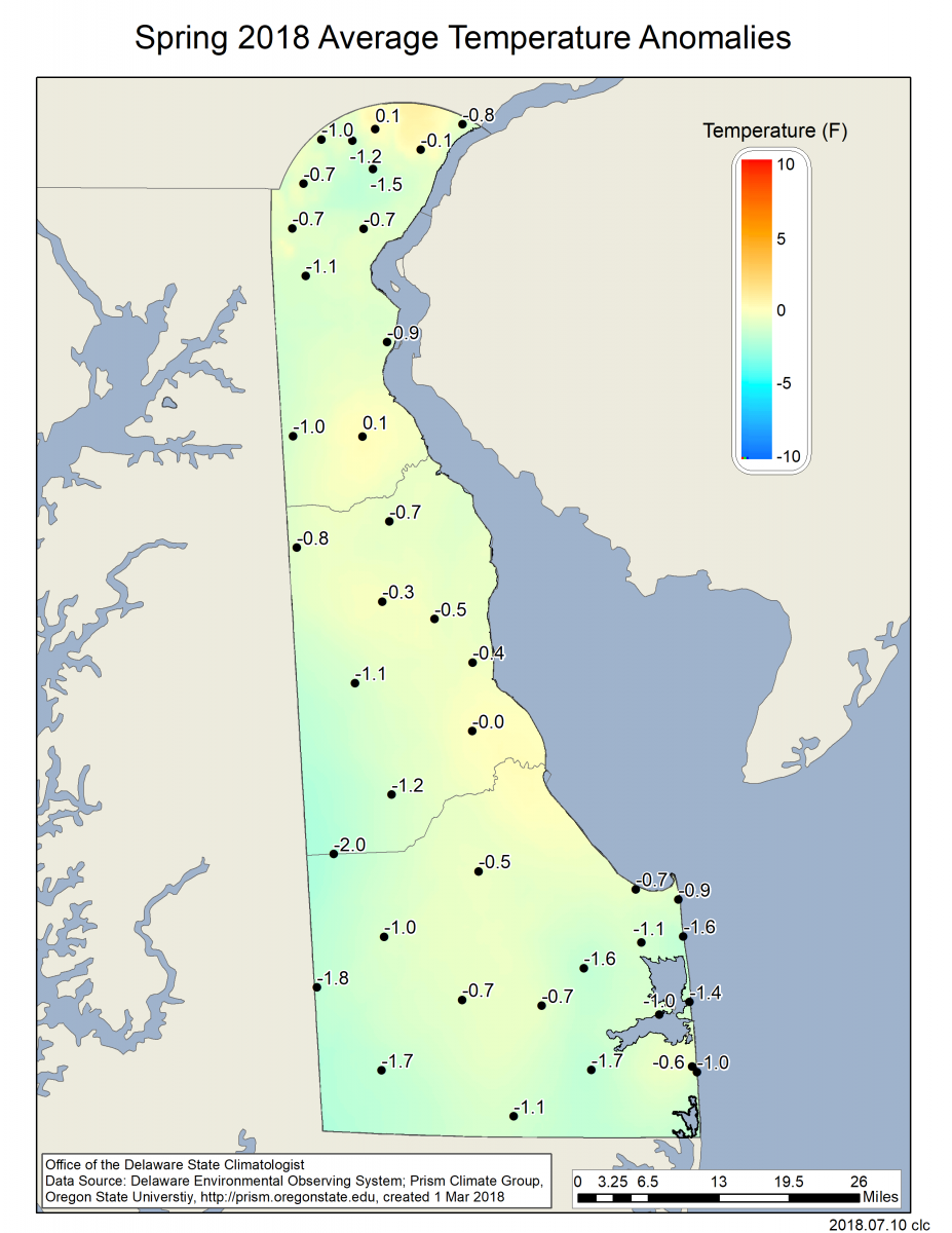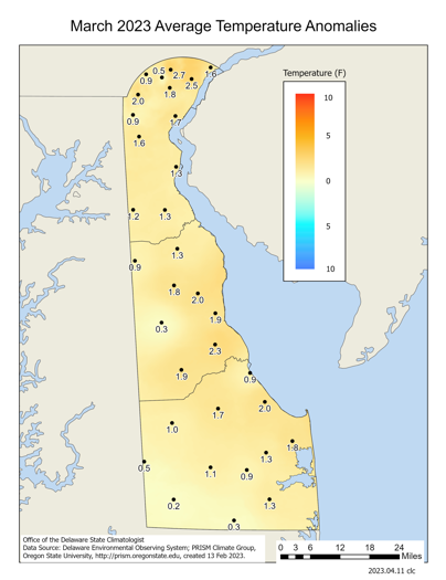 Data from the Delaware Environmental Observing System (DEOS) show that temperature departures were positive across the entire State (Figure 3), with many stations reaching anomalies of over 6o F. Precipitation varied across the State with much of Sussex and Kent counties recording positive precipitation departures, while much of New Castle County saw near or slightly below normal precipitation anomalies (Figure 4).