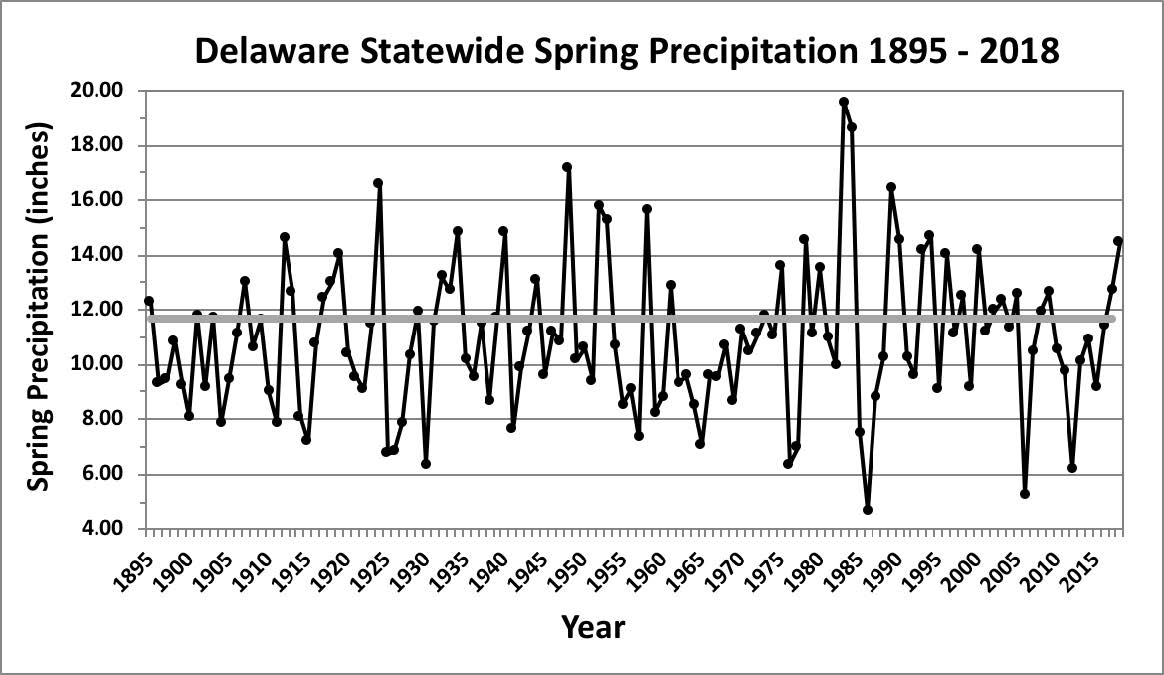 Delaware’s statewide precipitation for March 2025 averaged 5.44 inches, 1.32 inches above the 1991-2020 mean of 4.12 inches (Figure 2). March 2025 precipitation was in the top one-third of all March precipitation totals since 1895.