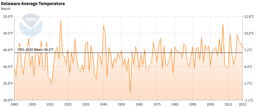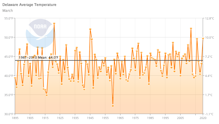- Figure 1. Delaware statewide mean March temperature (degrees F) 1895-2025. The black line indicates the 1991-2020 normal (NOAA, NCEI, Climate at a Glance: Statewide Time Series).