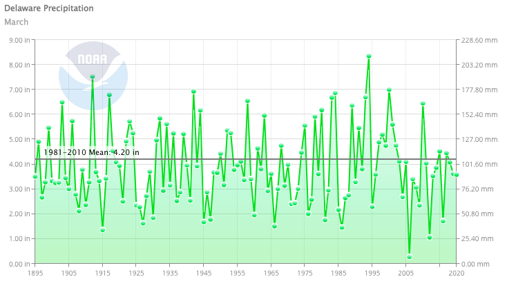 - Figure 2. Delaware statewide March precipitation (inches) 1895-2025. The Black line indicates the 1991-2020 normal (NOAA, NCEI, Climate at a Glance: Statewide Time Series).