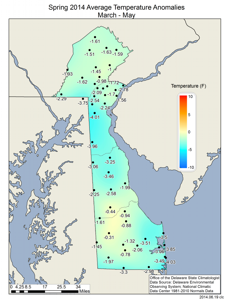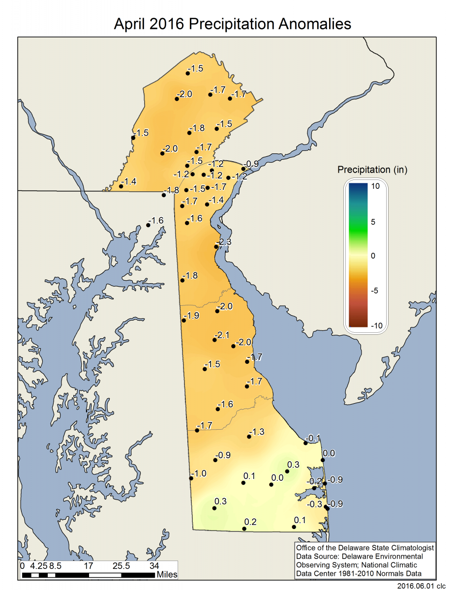 Data from the Delaware Environmental Observing System (DEOS) show that temperature departures were below normal across the entire State (Figure 4), with anomalies as much as 4o F below the average at some stations. Precipitation was generally below normal across the State except for a few stations in central Sussex and southern Kent Counties (Figure 5). Most stations saw precipitation departures of one inch or less.