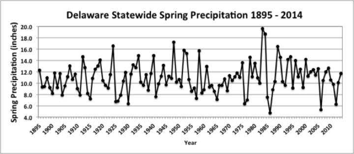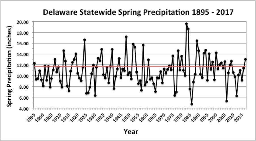 - Figure 3. Delaware statewide April precipitation (inches) 1895-2018. Light gray line indicates 1981-2010 normal.