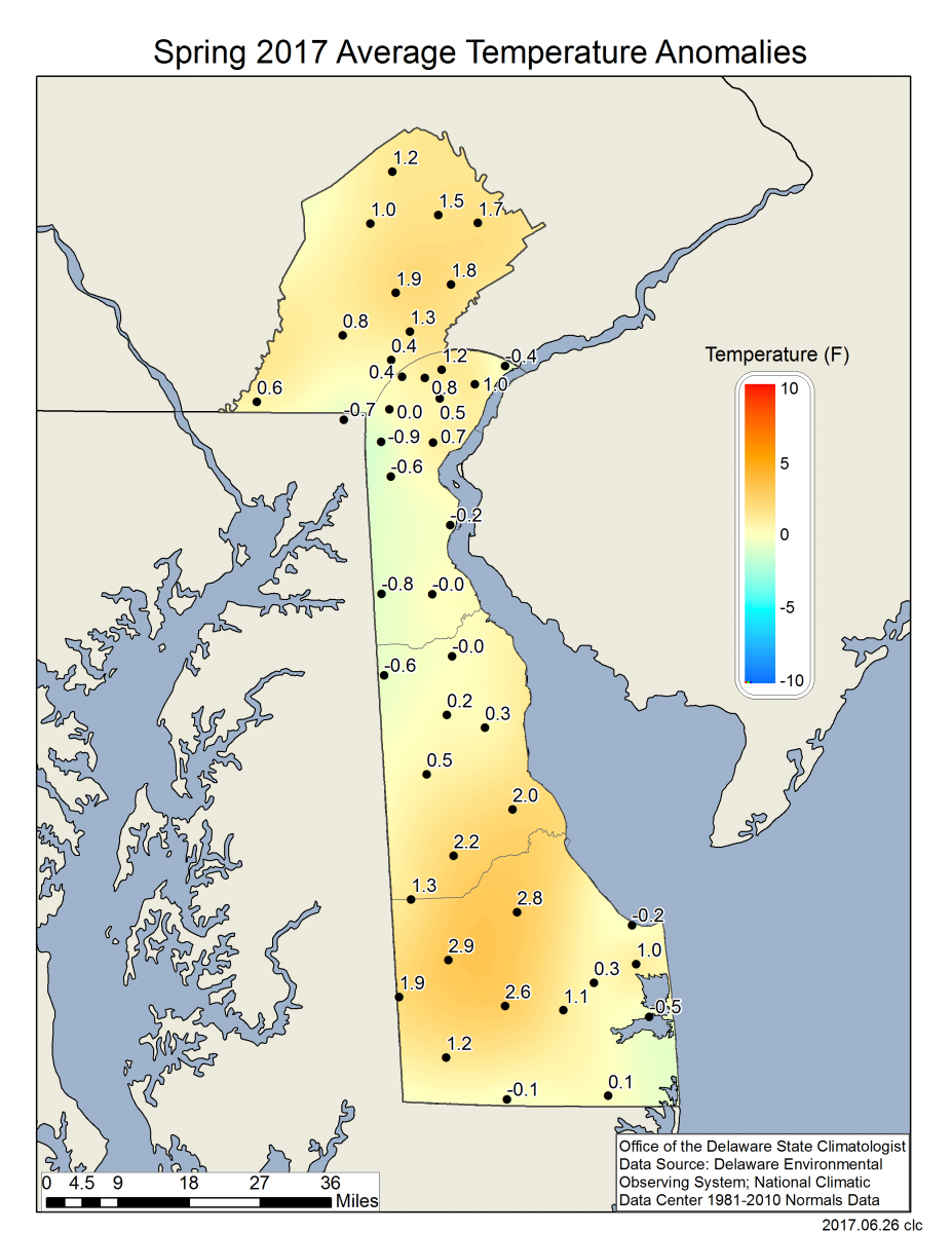 Preliminary data indicates that the statewide average temperature in April was 51.1°F, which is 2.4°F below the 1981-2010 mean value of 53.5°F (Figure 1). April 2018 was the 39th coolest April since 1895 and was 8.4°F below temperatures during April 2017. The cool conditions across Delaware were consistent with temperature anomalies across the eastern two-thirds of the United States where temperatures were similarly below normal (Figure 2).