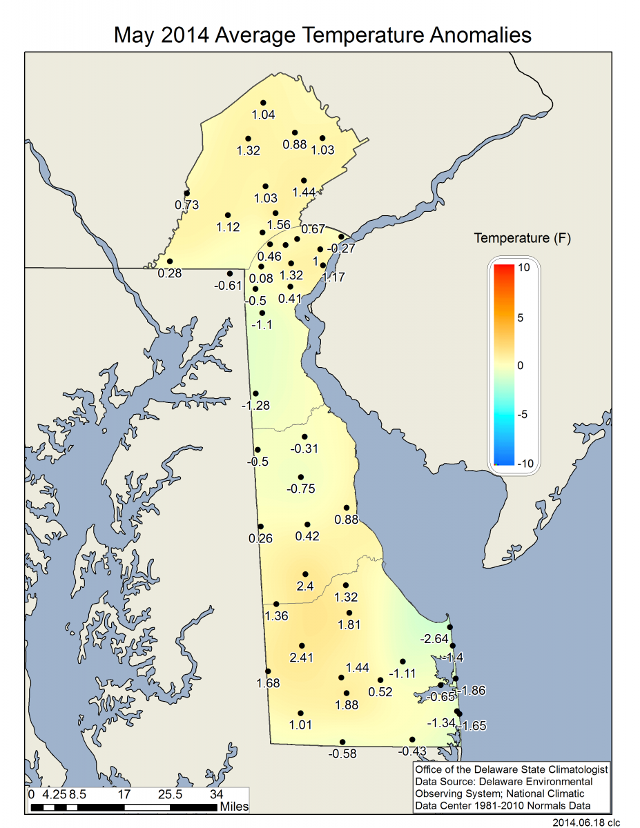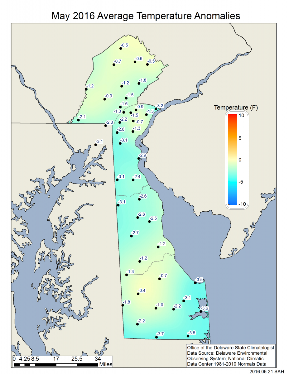 - Figure 3. May 2017 average temperature departures (°F) from the 1981-2010 mean based upon DEOS station data.