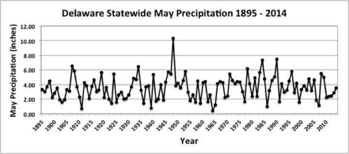 - Figure 2. Delaware statewide May precipitation (inches) 1895-2017. Red line indicates 1981-2010 normal.