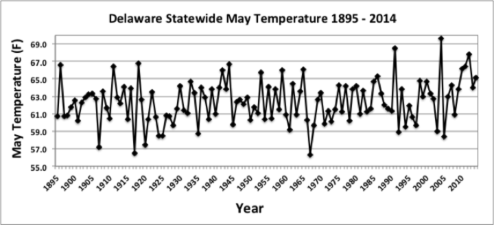 - Figure 1. Delaware statewide mean May temperature (°F) 1895-2017. Red line indicates 1981-2010 normal.