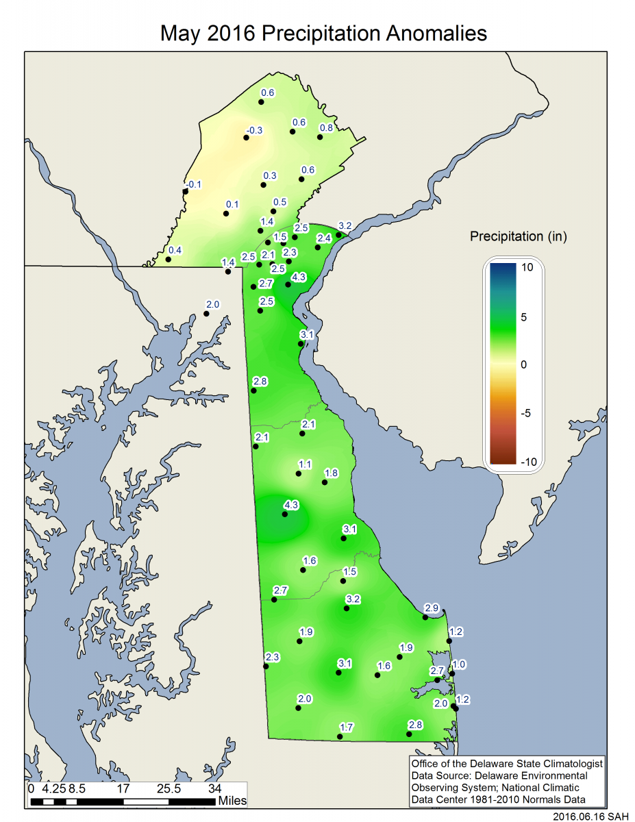 Delaware’s statewide precipitation for May 2017 averaged 5.92 inches, 2.06 inches above the 1981-2010 mean (Figure 2). May 2017 was only the second of the last eight months with above normal precipitation across the First State.