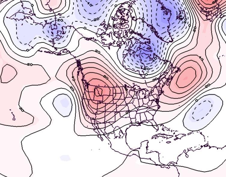 - Figure 7. 500 hPa geopotential height anomalies for June 2025. Negative (blue) anomalies indicate the presence of an anomalous jet stream trough while positive (red) height anomalies indicate the presence of an anomalous jet stream ridge.