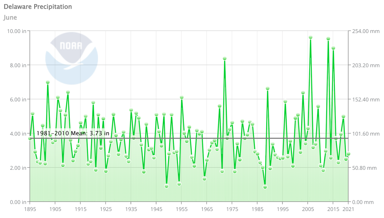 - Figure 2. Delaware statewide June precipitation (inches) 1895-2025. The Black line indicates the 1991-2020 normal (NOAA, NCEI, Climate at a Glance: Statewide Time Series).
