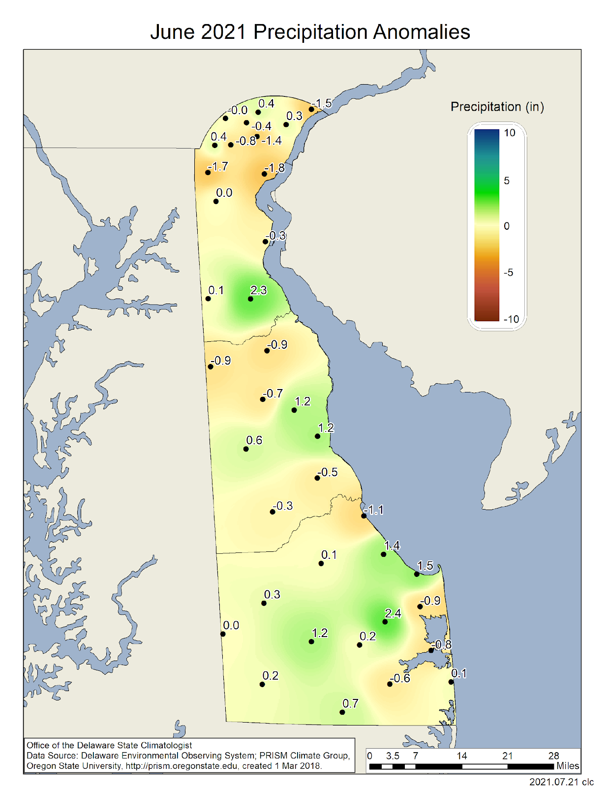 Data from the Delaware Environmental Observing System (DEOS) show that temperature departures were positive across the entire State (Figure 3), with the largest temperature anomalies found across Sussex County. Precipitation varied greatly across the State due to the convective nature of rainfall associated with thunderstorms (Figure 4). However, most stations saw below normal precipitation for the month.