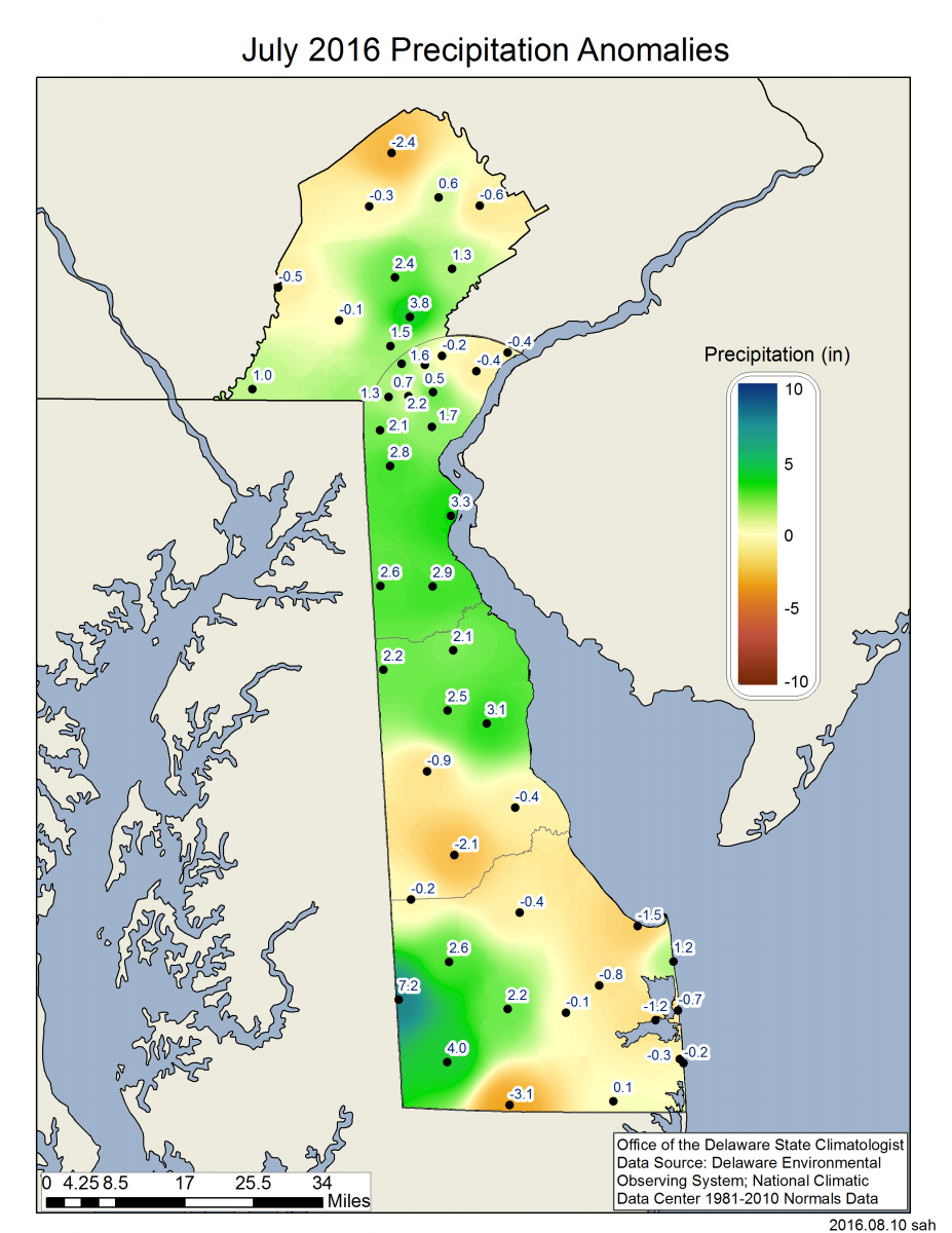 - Figure 4. July 2017 precipitation departures (inches) from the 1981-2010 mean based upon DEOS station data.