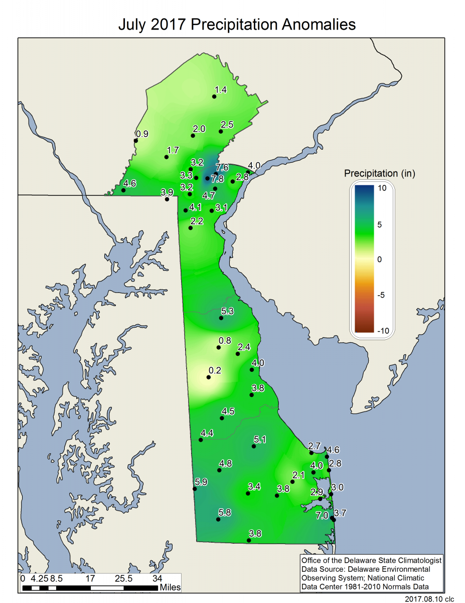 Delaware’s statewide precipitation for July 2017 averaged 8.47 inches, 4.33 inches above the 1981-2010 mean of 4.14 inches (Figure 2). This was the highest statewide precipitation total since September 2016, and the 6th wettest July since 1895.