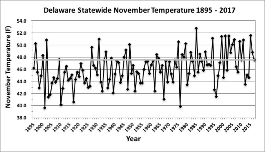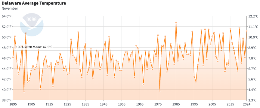 - Figure 1. Delaware statewide mean November temperature (oF) 1895-2025. The black line indicates the 1991-2020 normal (NOAA, NCEI, Climate at a Glance: Statewide Time Series).