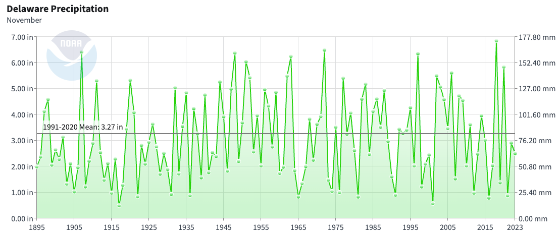 - Figure 2. Delaware statewide November precipitation (inches) 1895-2025. The Black line indicates the 1991-2020 normal (NOAA, NCEI, Climate at a Glance: Statewide Time Series).