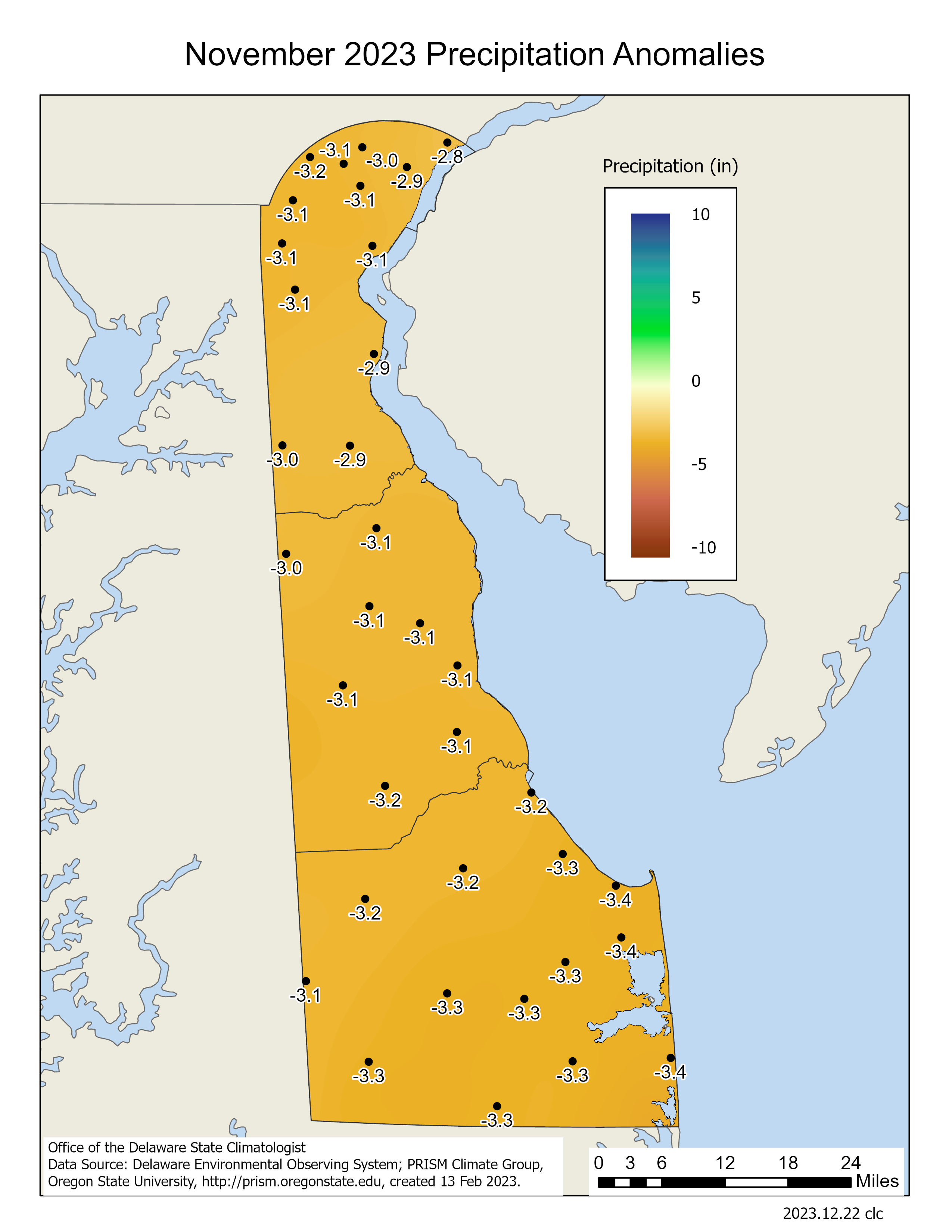 Data from the Delaware Environmental Observing System (DEOS) show that temperatures were generally below normal across the entire State except for extreme northern Delaware (Figure 3). Precipitation was uniformly below normal, with the largest negative departures found across Kent and Sussex Counties (Figure 4).