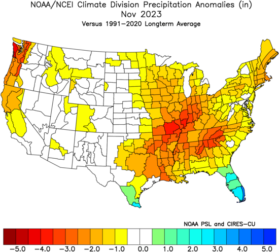 - Figure 6. United States climate division precipitation anomalies (inches) for November 2025 (NOAA, NCEI, Climate at a Glance: Divisional Mapping).