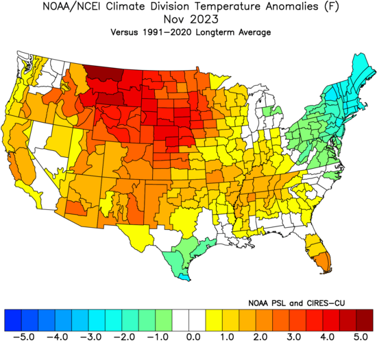 - Figure 5. United States climate division temperature anomalies (degrees F) for November 2025 (NOAA, NCEI, Climate at a Glance: Divisional Mapping).