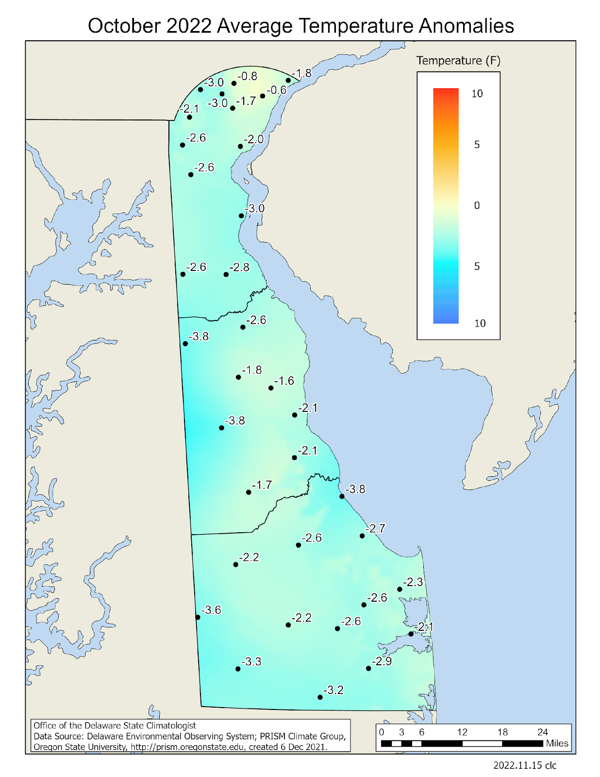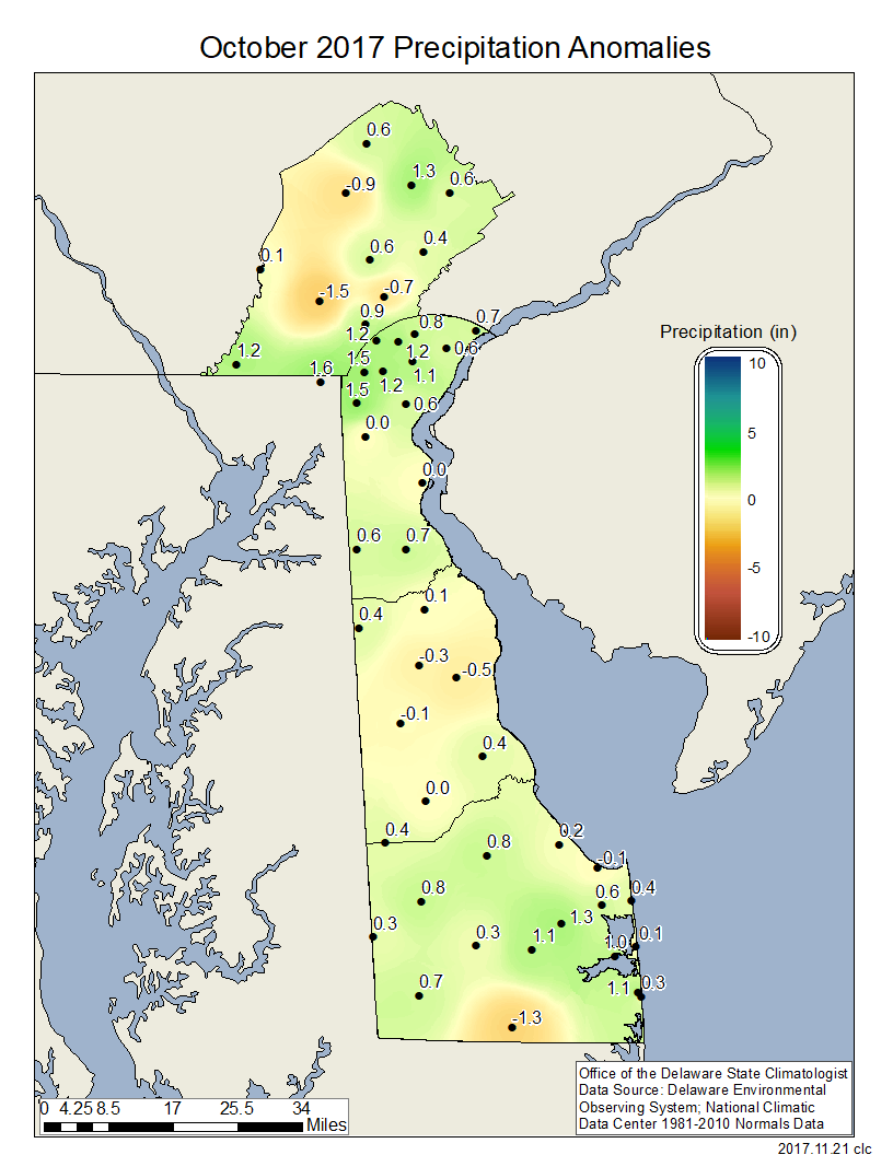 Data from the Delaware Environmental Observing System (DEOS) show that temperature departures were mixed across the State (Figure 3), with many stations seeing negative anomalies in Kent and Sussex Counties, while much of New Castle County saw positive temperature departures. Precipitation was below normal across almost the entire State (Figure 4) with most stations recording negative anomalies of between 0.5 and 1.5 inches.
