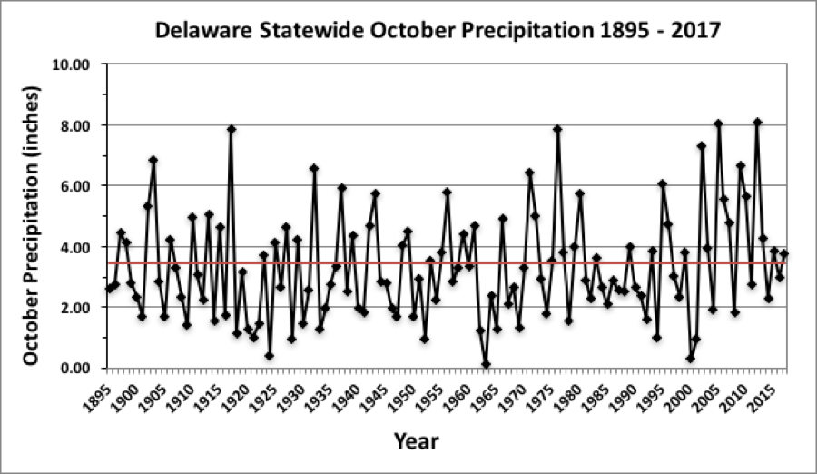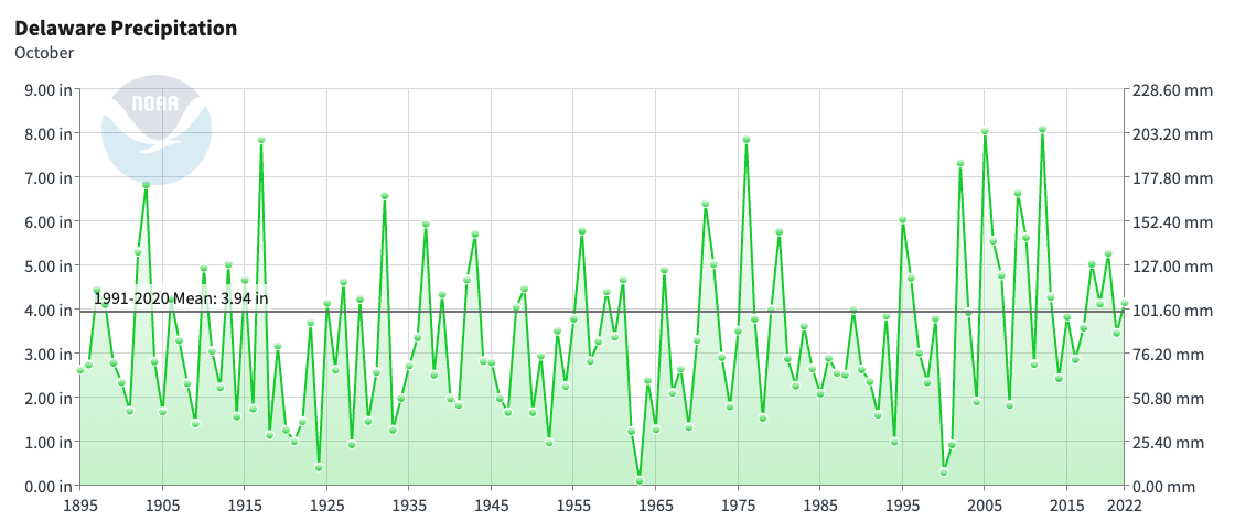 - Figure 2. Delaware statewide October precipitation (inches) 1895-2025. The Black line indicates the 1991-2020 normal (NOAA, NCEI, Climate at a Glance: Statewide Time Series).