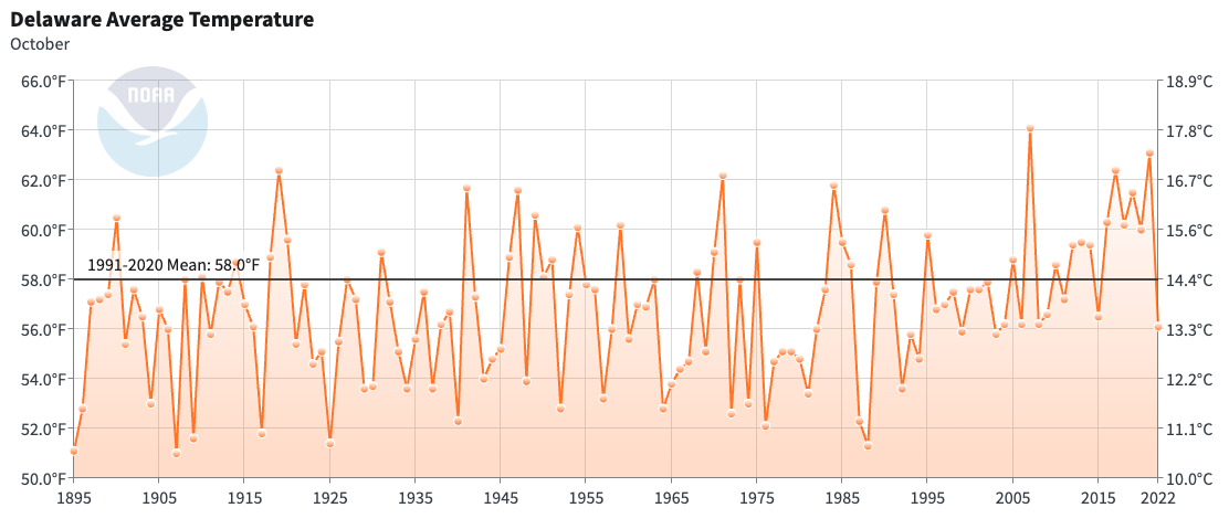 - Figure 1. Delaware statewide mean October temperature (degrees F) 1895-2025. The black line indicates the 1991-2020 normal (NOAA, NCEI, Climate at a Glance: Statewide Time Series).