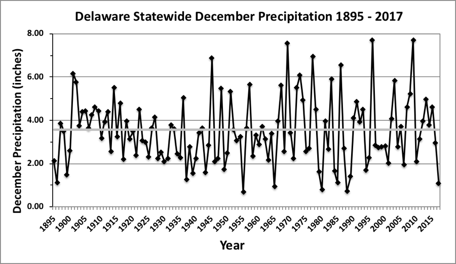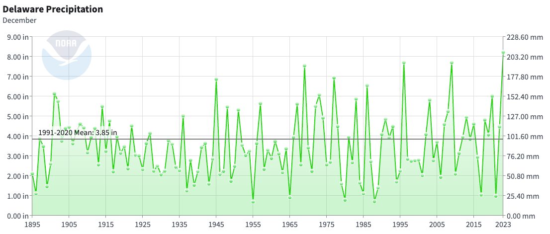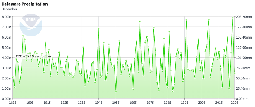 - Figure 2. Delaware statewide December precipitation (inches) 1895-2024. The Black line indicates the 1991-2020 normal (NOAA, NCEI, Climate at a Glance: Statewide Time Series).