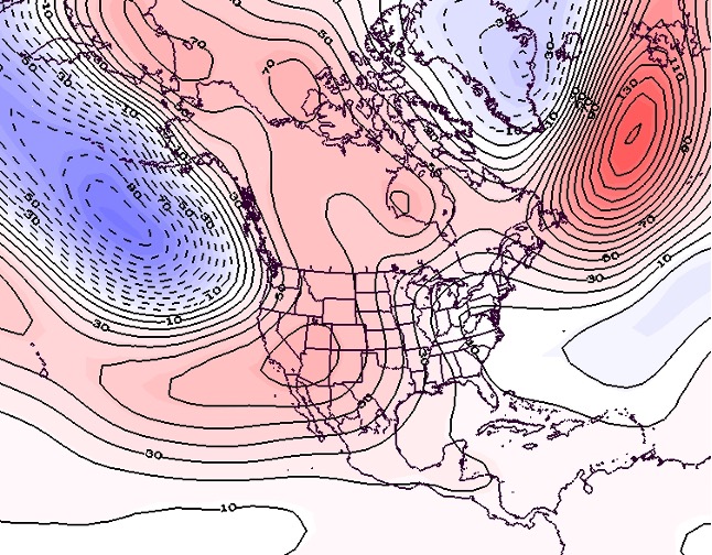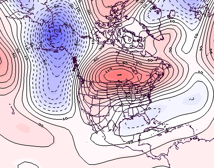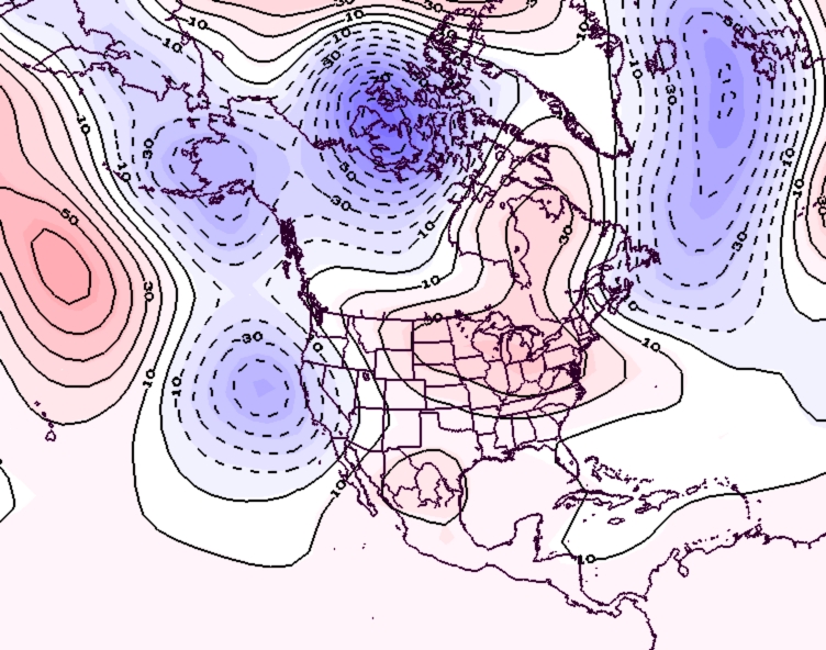- Figure 7. 500 hPa geopotential height anomalies for December 2024. Negative (blue) anomalies indicate the presence of an anomalous jet stream trough while positive (red) height anomalies indicate the presence of an anomalous jet stream ridge.