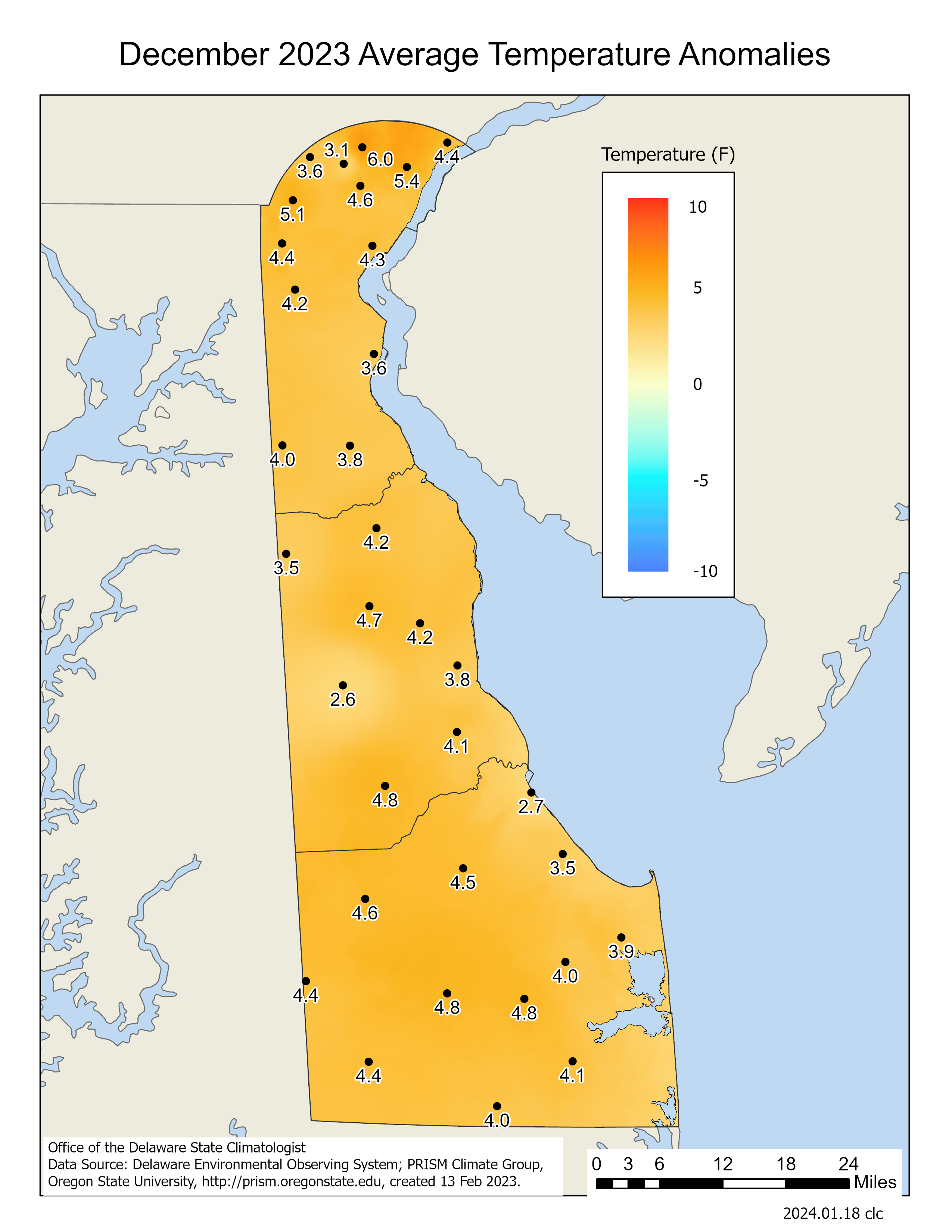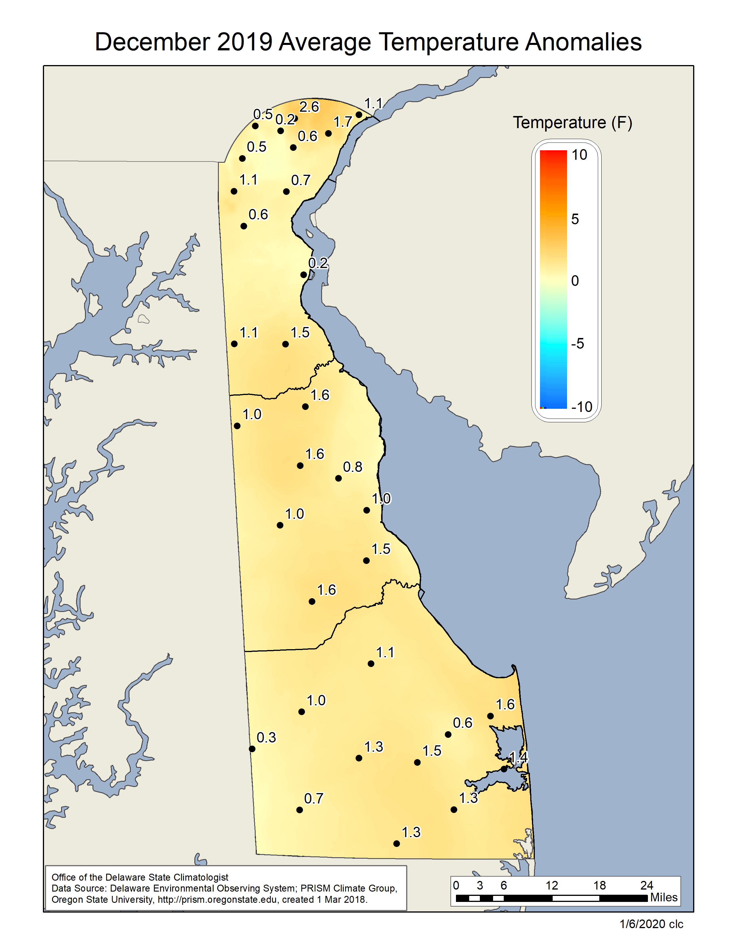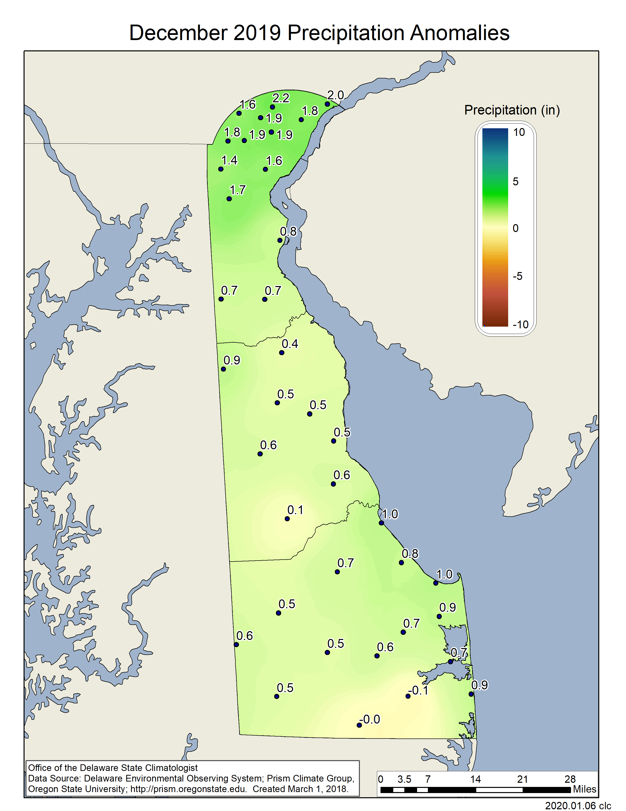 Data from the Delaware Environmental Observing System (DEOS) show that temperature departures varied across the State, with generally small positive or negative anomalies depending on the specific location (Figure 3). Precipitation anomalies were negative across the entire state, with southeast Sussex County seeing the largest negative departures for the month (Figure 4).