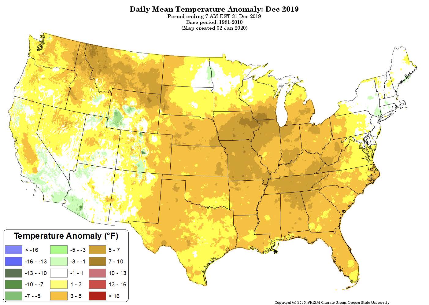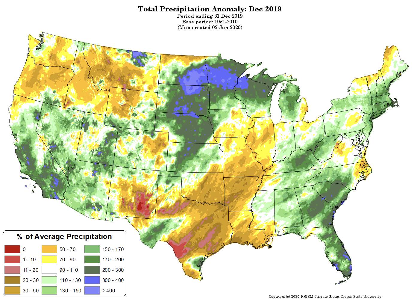 Temperatures were above normal across the entire United States in December (Figure 5), with locations in the Rocky Mountains and the High Plains seeing departures between 7° and 9° F. Precipitation varied greatly across the country (Figure 6). Much of the southern tier of the U.S. and the south Atlantic Coast saw below normal precipitation amounts, while the Pacific Northwest, portions of the Mississippi Valley and New England had greater than normal precipitation. The 500 hPa height pattern for December showed an anomalous jet stream ridge across the western two-thirds of the United States (Figure 7) contributing to the temperature anomalies across the country.