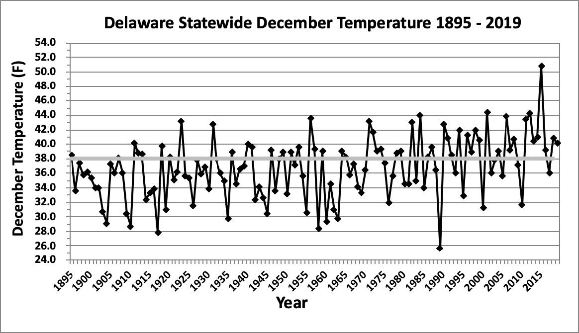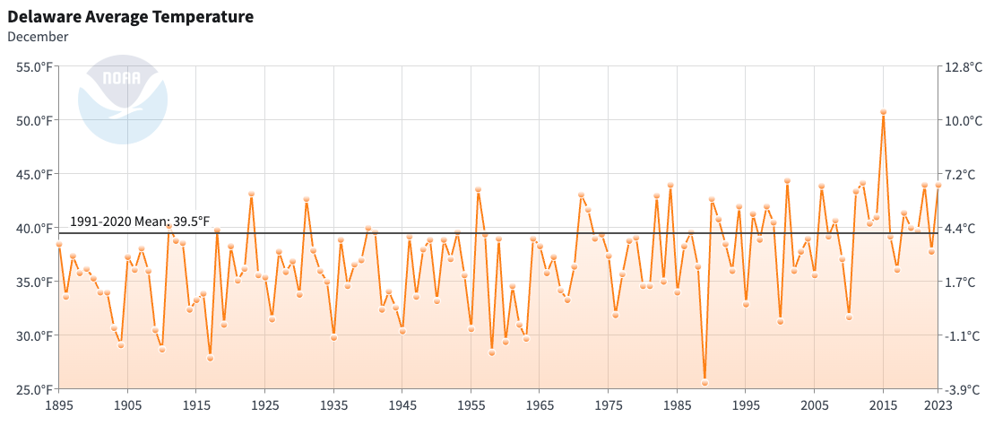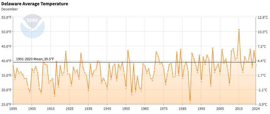 - Figure 1. Delaware statewide mean December temperature (degrees F) 1895-2024. The black line indicates the 1991-2020 normal (NOAA, NCEI, Climate at a Glance: Statewide Time Series).