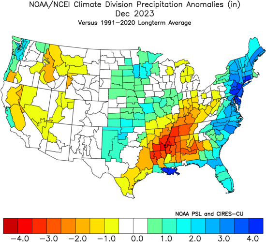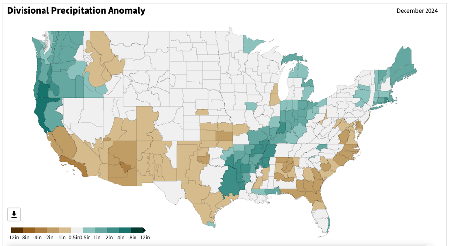 - Figure 6. United States climate division precipitation anomalies (inches) for December 2024 (NOAA, NCEI, Climate at a Glance: Divisional Mapping).