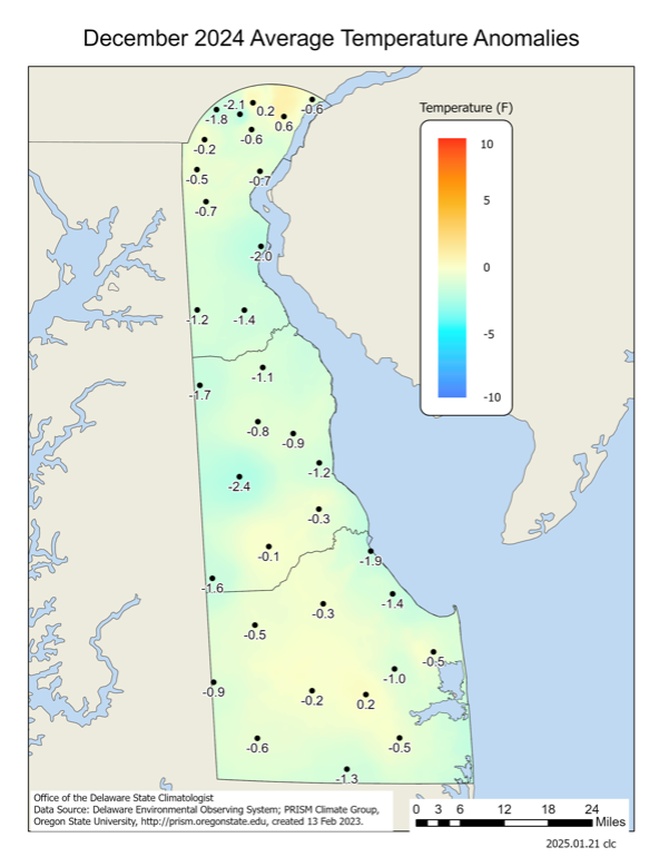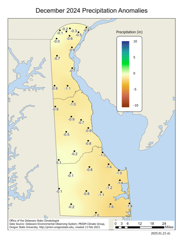 Delaware’s statewide precipitation for December 2024 averaged 2.45 inches, 1.40 inches below the 1991-2020 mean of 3.85 inches (Figure 2). December marked the 5th month in a row with below normal precipitation values across Delaware.