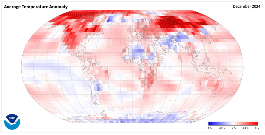 - Figure 8. Global temperature anomalies (oC) for December 2024 (NOAA, NCEI, Climate at a Glance: Global Mapping).