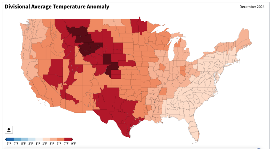 - Figure 5. United States climate division temperature anomalies (oF) for December 2024 (NOAA, NCEI, Climate at a Glance: Divisional Mapping).