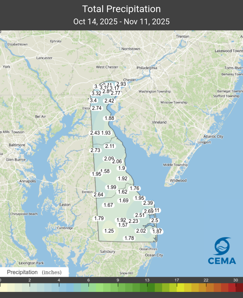 Most of Delaware has continued to see lower than normal precipitation, with the only exceptions being portions of northern New Castle County and eastern Sussex County, which have seen 2.5 to 3.5 inches over the last 30 days (Figure 1).