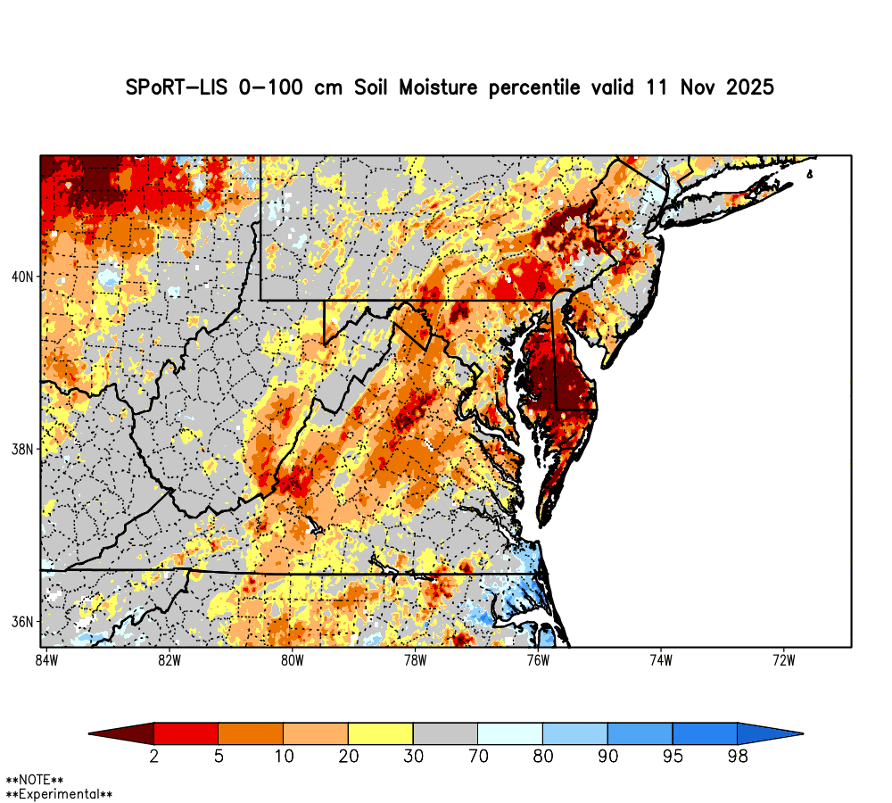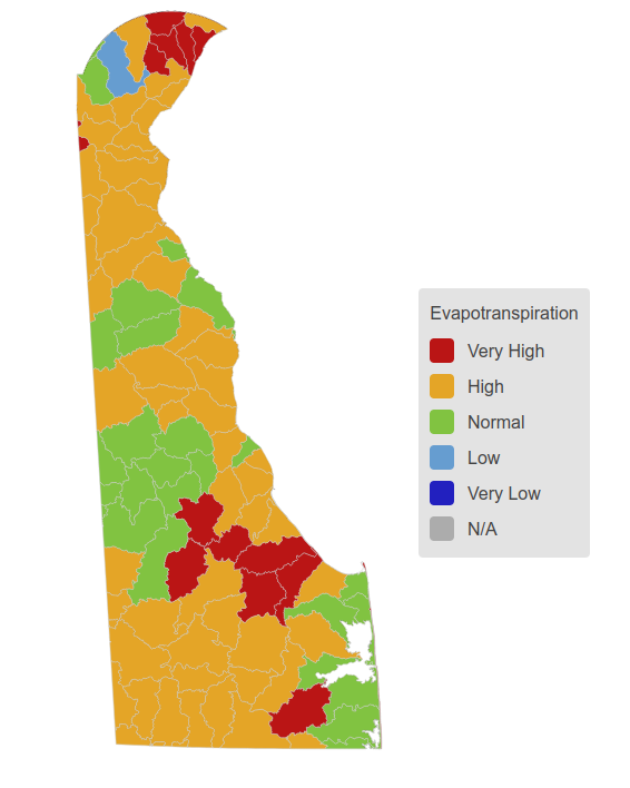 Soil moisture levels in the top meter of soil remain below the 10th percentile across much of Delaware (Figure 3).