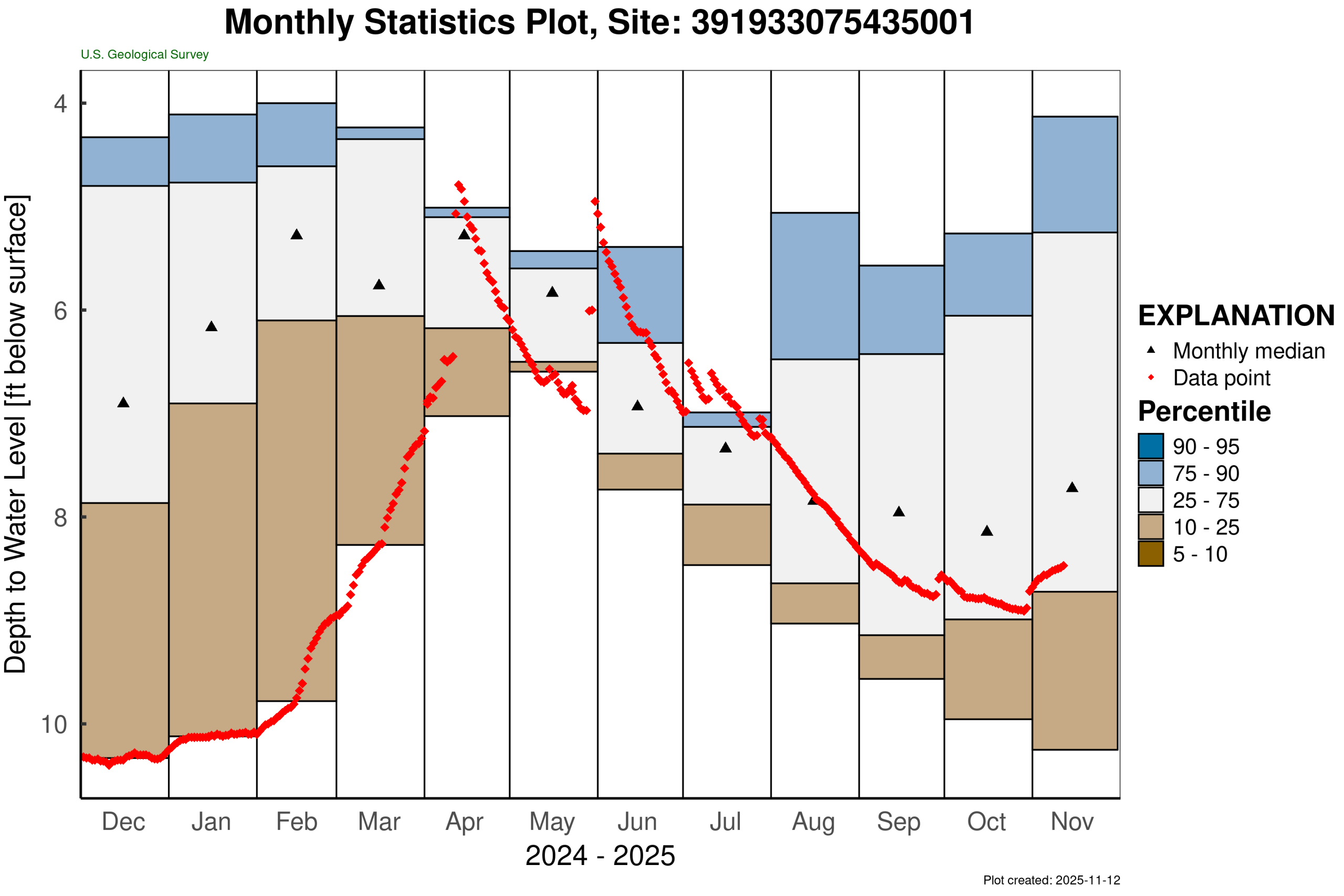 Low groundwater levels—such as those observed in parts of Kent County—can put stress on local water supplies and increase the potential for shortages if dry weather continues into the winter months. Continued monitoring will help track whether recharge improves with late fall and winter precipitation.