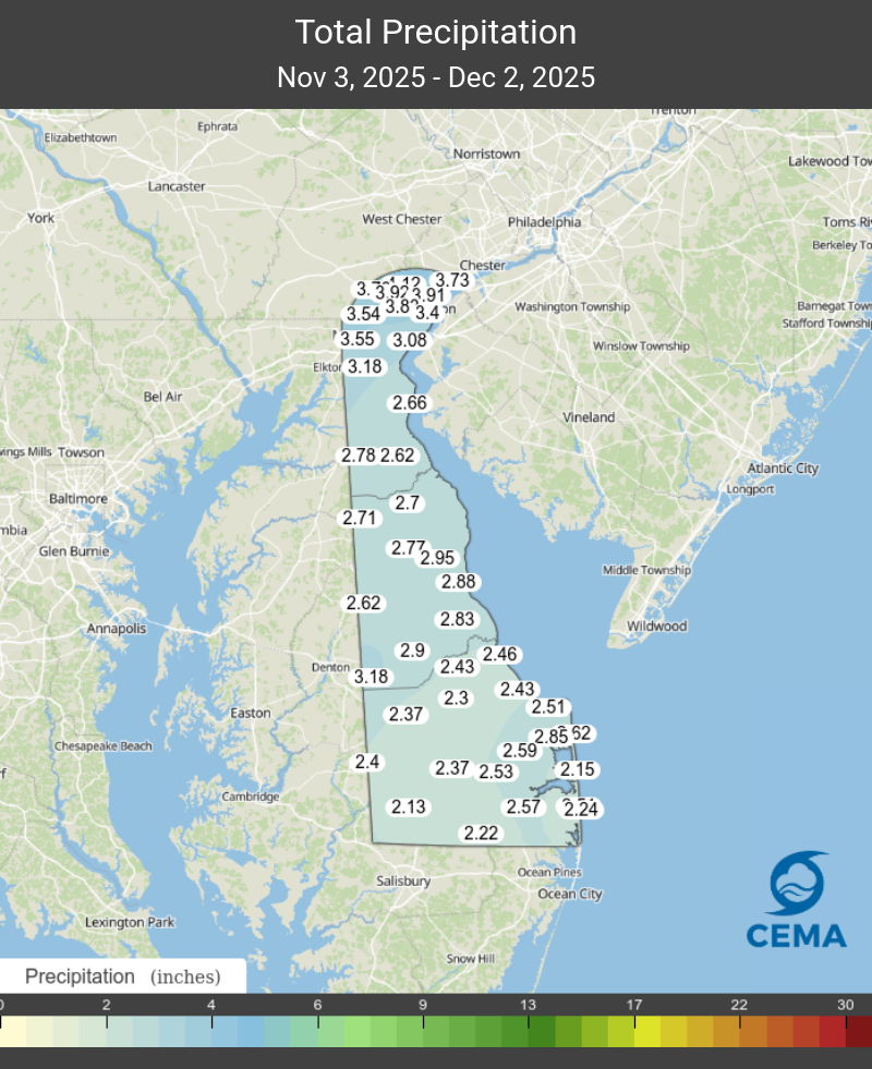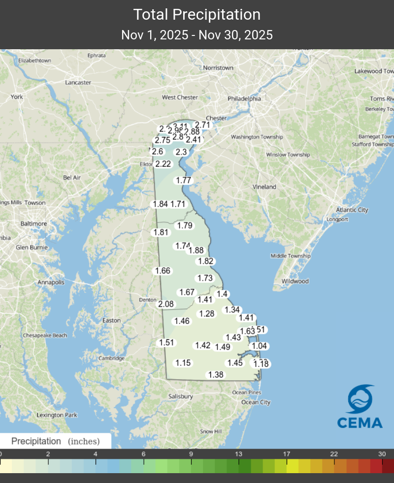 - November precipitation was below normal, marking Delaware’s 4th straight month with below normal precipitation