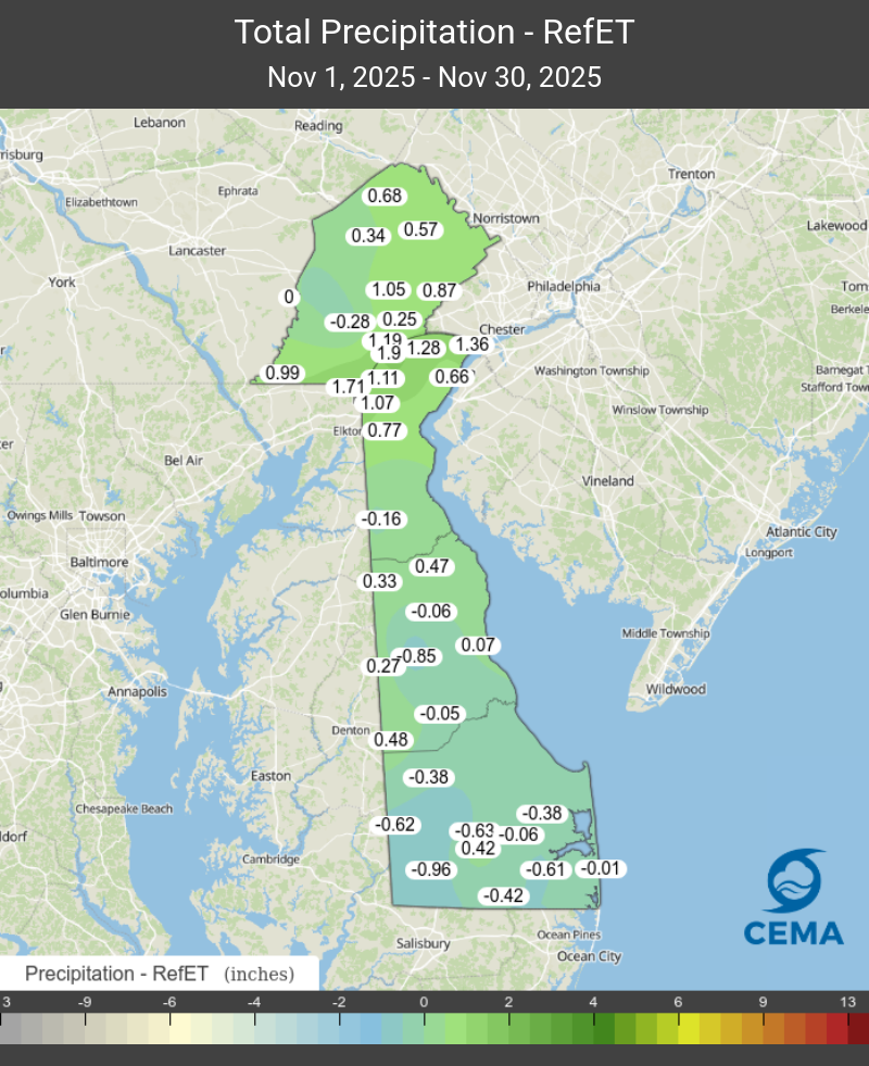 Water balance conditions were mixed across Delaware in November. While northern Delaware generally saw a surplus in P-ET (i.e., Precipitation minus Evapotranspiration), southern Delaware saw deficits in P-ET (see Figure 2).