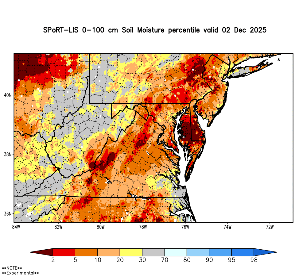 With limited precipitation and low evapotranspiration rates, soil moisture conditions in the top meter of soil have remained stable over the last few weeks. Unfortunately, that still means the entire state is experiencing soil moisture conditions at or below the 20th percentile for this time of year. Figure 3 also shows that most of Delaware south of Dover currently has near record low soil moisture conditions (going back to 2010).