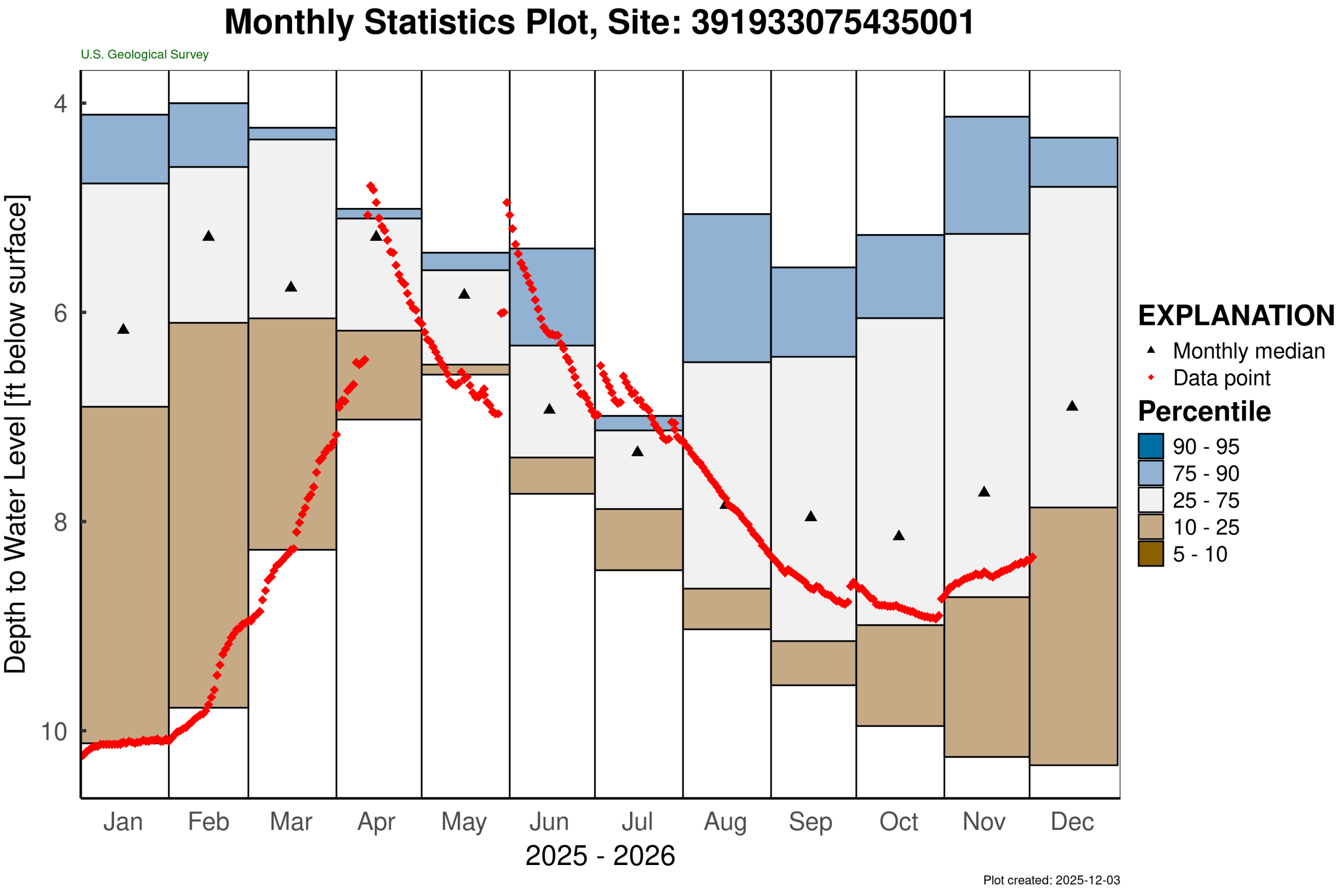 Elsewhere in the state, groundwater conditions vary. A groundwater monitoring well in southern New Castle County (Hb12-05), which has been at the low end of normal since September, has fallen into the below normal range during these first few days in December. (Figure 4). A groundwater monitoring well in southwestern Kent County (Mc51-01a) has been declining steadily since late April and remains below the 5th percentile at 17.09 feet below land surface; potentially a new record low. In southeastern Sussex County, well Pf24-02 has remained within the normal range since May, with a brief period of above-normal levels in early August.