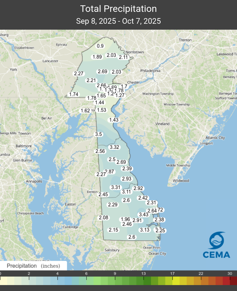 Looking at short-term precipitation, most of Delaware has seen below normal precipitation over the last 30 days (since September 7th). The lone exception is northern Kent County between Dover and Smyrna, which has received between 3 and 3.5 inches of precipitation over that timeframe.