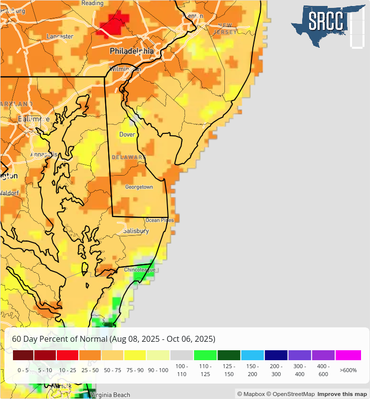 Looking at short-term precipitation, most of Delaware has seen below normal precipitation over the last 30 days (since September 7th). The lone exception is northern Kent County between Dover and Smyrna, which has received between 3 and 3.5 inches of precipitation over that timeframe.